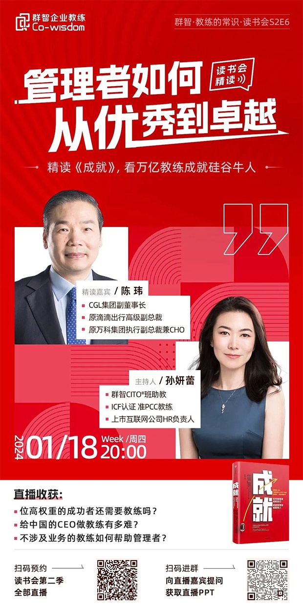 1月18日,我们邀请了前滴滴出行高级副总裁陈玮老师为大家精读《成就》,分析“万亿美元教练”比尔·坎贝尔是如何和全球顶级高管们保持十多年教练关系的,帮助大家看到影响成功管理者取得更大成功的关键卡点,找到解决办法,成为卓越的管理者。